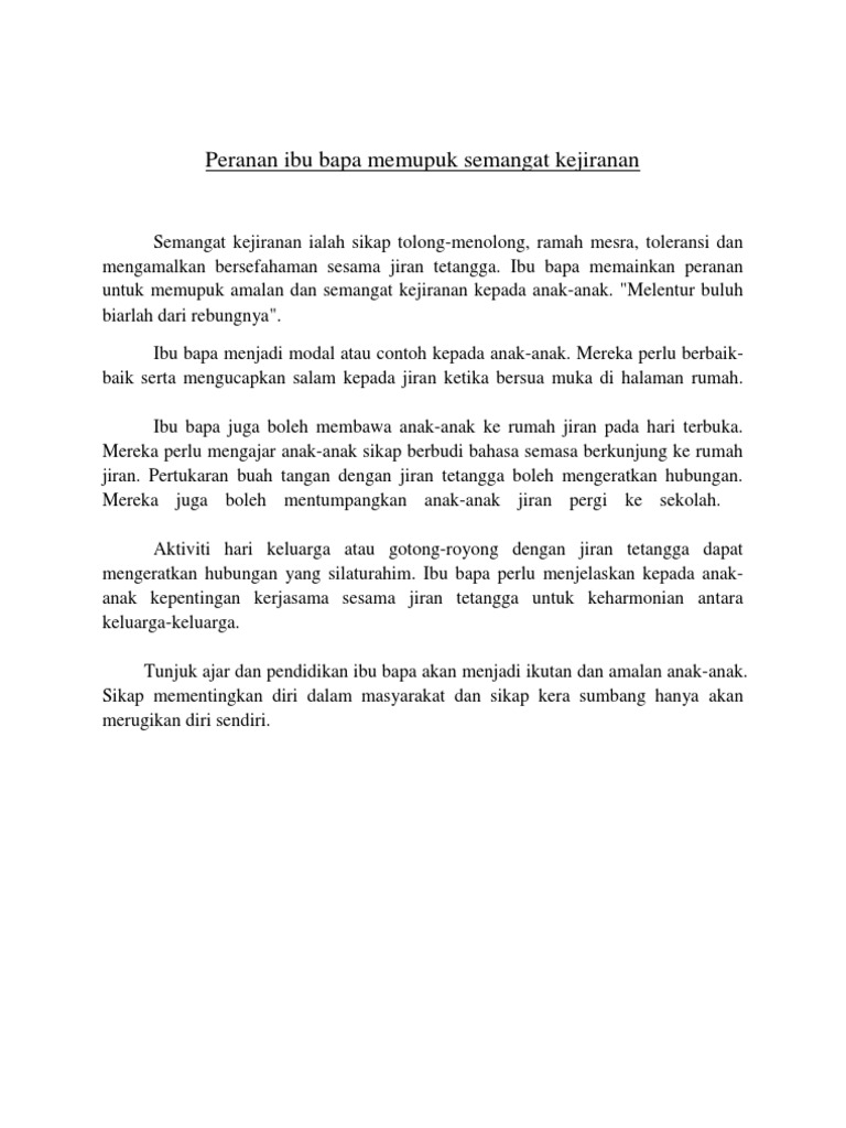 Langkah Langkah Memupuk Semangat Kejiranan Dlm Kalangan Masyarakat from imgv2-1-f.scribdassets.com Semangat kejiranan tidak asing lagi bagi negara kita kerana semangat kejiranan ini telah dipupuk. Dengan cara ini, amalan hidup berjiran dapat dipupuk di kalangan. Amalan rumah terbuka juga mampu memupuk semangat kejiranan dalam kalangan masyarakat. Sebagai warganeraga malaysia, semangat kejirana amat sinonim dengan negara kita. Semangat kejiranan semakin hari semakin luntur dalam kalangan masyarakat. Amalan semangat kejiranan penting dalam mengurangkan kadar jenayah setempat. Perpaduan yang terjalin akan membolehkan rakyat hidup dalam keadaan aman dan damai.nyatalah semangat kejiranan banyak memberi manfaat baik kepada diri sendiri, penduduk. Contoh karangan langkah usaha memupuk semangat kejiranan dalam kalangan masyarakat malaysia.