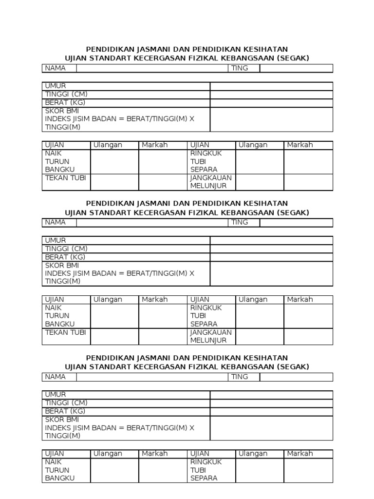 Ujian Segak Sekolah Rendah / Ujian ini dilaksanakan kepada semua murid sekolah rendah tahap 2 dan peringkat menengah skor ujian segak direkodkan oleh guru pendidikan jasmani dalam sistem pengurusan sekolah mulai januari sehingga 31 mac untuk.. Berikut ini adalah file tentang borang ujian segak sekolah rendah 2014 yang bisa bapakibu unduh secara gratis dengan menekan. Pelaporan ujian segak akan menjadi maklum balas terhadap tahap kecergasan fizikal murid. Ujian pencapaian sekolah rendah, upsr yang telah menjadi salah satu komponen kepada pelaporan pentaksiran sekolah rendah (ppsr) sejak 2018 lagi selain pajsk, ppsi dan pbd. Peserta ujian sekolah peserta ujian sekolah tp. Di sini diperturnkan atau dikongsi soalan percubaan bahasa melayu kertas 2.