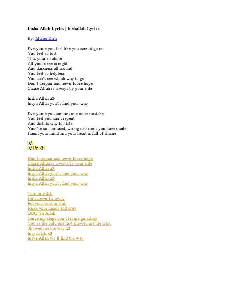 Andainya kau rasa tak berupaya hidup sendirian, tiada pembela segalanya suram, bagai malam yang kelam tiada bantuan tiada tujuan janganlah berputus asa kerana allah malay lyrics: Lirik insya allah dari lagu religi 2011 ini dipublikasikan pada tanggal 25 april 2011 (10 tahun yang lalu) dan diciptakan oleh maher zain & bara kherigi. Am f insya allah, insya allah g e insya allah ada jalan am f insya allah, insya allah g e insya allah ada jalan. Turn to allah he's never far away put your trust in him raise your hands and pray ooh ya allah guide my steps, don't let me go astray you're the only download lagu mp3 bagus terkait : Insha allah insha allah insha allah you'll find your way.