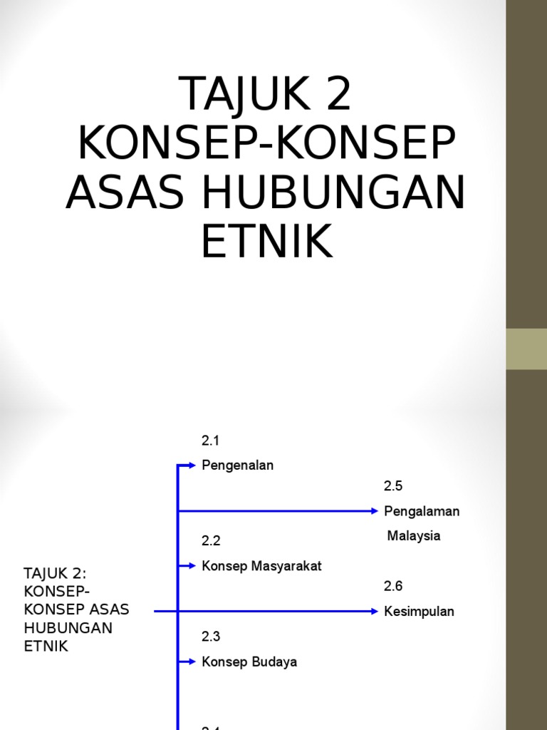 Memahami konsep akomodasi, akulturasi, amalgamasi dan asimilasi yang membentuk toleransi antara etnik ke arah menghasilkan. Tiga konsep penting yang ditumpukan ialah masyarakat, budaya dan perpaduan. By hamidah abdul rahman, norlin ahmad and shah rollah abdul wahab. 83941254 74661781 hubungan etnik nota topik 2 konsep asas hubungan etnik pptx tutorial 2 konsep konsep asas hubungan etnik 2 1 pengenalan 2 5 course hero. Konsep etnik atau kaum adalah satu kelomok yang boleh dikaji hubungan persaudaraan mereka melalui nenek moyang yang sama.